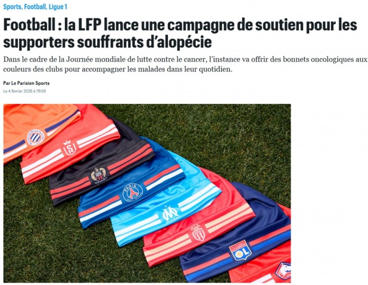 2月5日讯 《巴黎人报》报道,法国职业足球联盟于2月4日世界抗癌日宣布启动一项旨在支持因接受治疗导致脱发的球迷的团结活动。